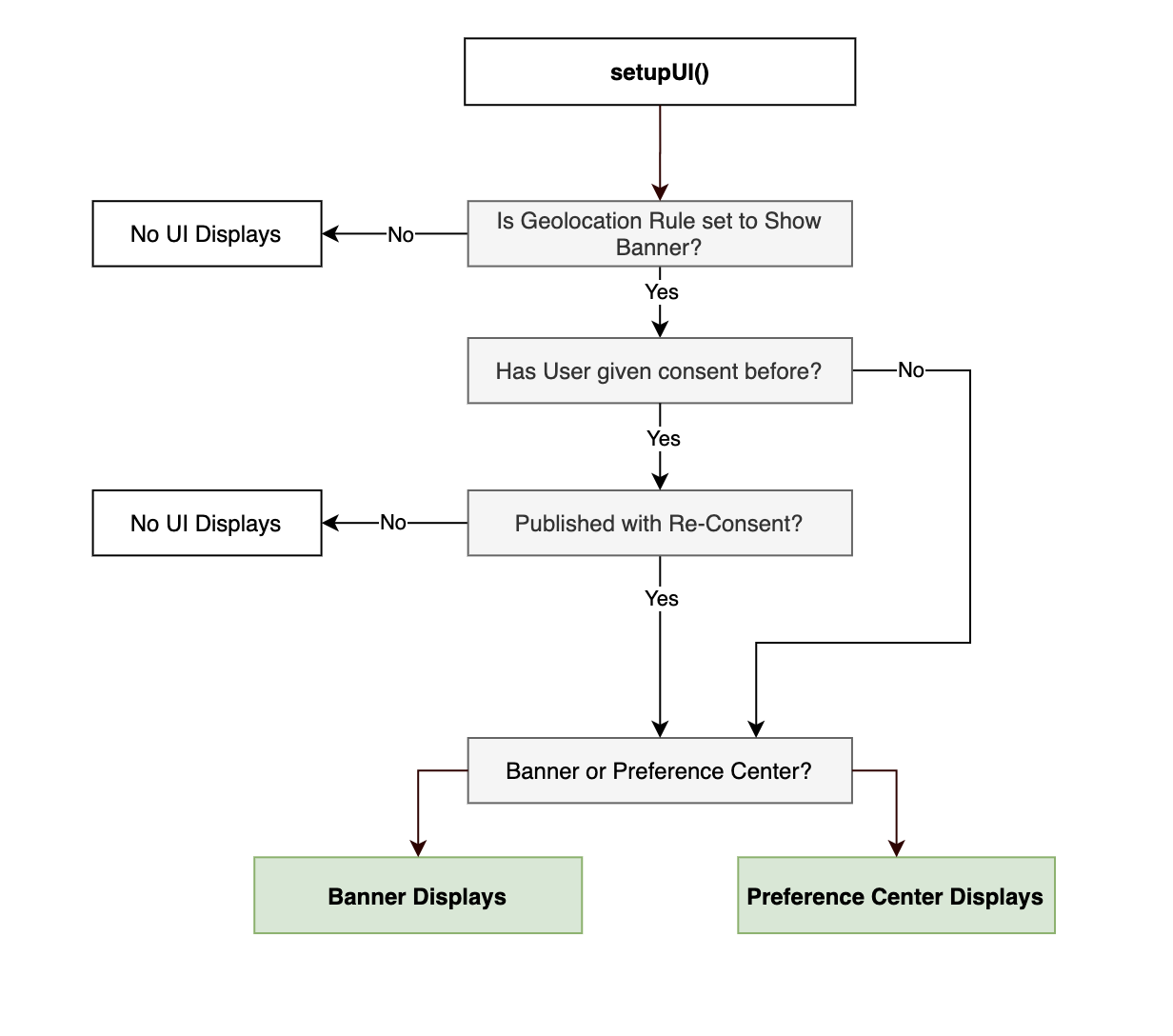 setupUIThis method can be used to render a UI for Banner or Preference Center. When coupled with a UIType, setupUI()automatically evaluates the shouldShowBanner() logic to determine whether or the specified UI should be shown to users. See below for more info on how shouldShowBanner() gets calculated.